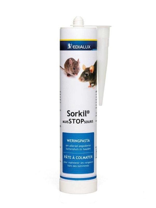De Edialux Sorkil Muis Stop bestaat uit een pasta van plantaardige oliën, vulmiddel en polystreen bolletjes. Het product kan worden gebruikt voor het afdichten van naden, kieren, sparingen, doorvoeringen en zettingsscheuren. Er dient minimaal een lag van 10 mm te worden aangebracht. Wanneer wordt gemorst dient dit meteen schoon te wordengemaakt. Dit kan met een droge doek of in een terpetine gedrengte doek. Ook gebruikte gereedschappen kunnen met terpetine gereinigd worden.