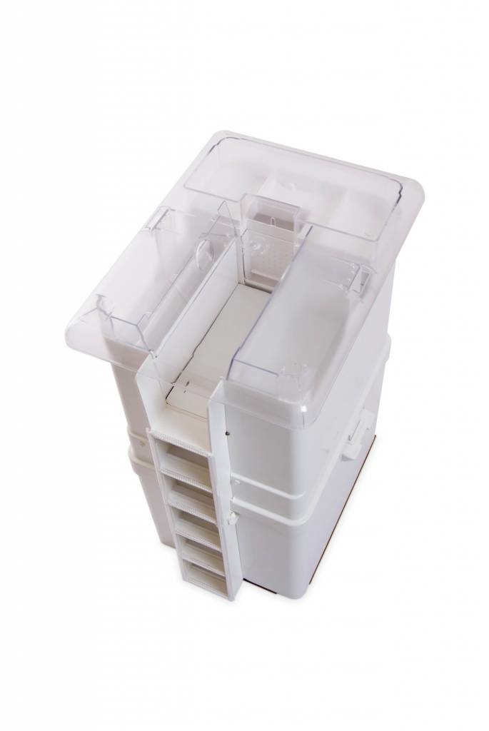Dit onderste compartiment is gevuld met een vloeistof. Hierdoor worden de gevangen ratten en muizen op een diervriendelijke wijze bedwelmd waarna ze zonder stress vrijwel direct sterven. De dieren worden door de vloeistof op natuurlijke wijze geconserveerd. Door de uitgekiende techniek en de samenstelling van de vloeistof is dit apparaat absoluut veilig, reukloos en hygiënisch.