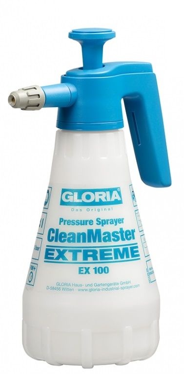 De drukspuit CleanMaster Extreme EX 100 met een vulinhoud van 1 liter is zeer bestand tegen zowel koolwaterstof- als paraffine houdende middelen en middelen die organische oplosmiddelen bevatten. De EX 100 is de ideale hulp als er zeer hoge eisen aan de bestendigheid worden gesteld. De tank van zeer bestendig polyethyleen, een sproeikop van polyoxymethyleen en afdichtingen van Viton Plus zorgen ervoor dat de drukspuit ook bestand is tegen benzine, benzeen, alcohol en olie.