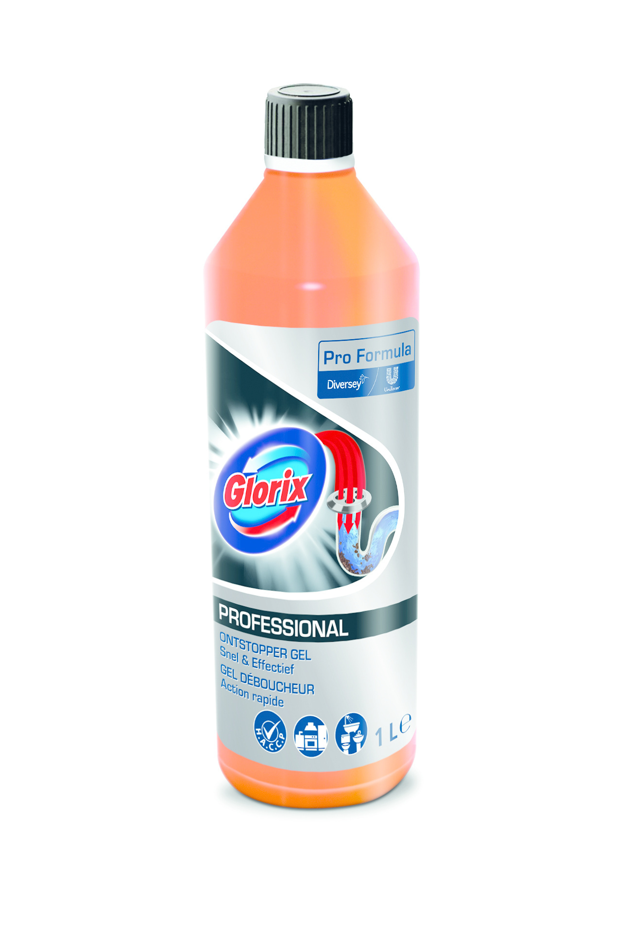 Professionele Glorix Ontstopper Gel voor gebruik in keukens en badkamers. De gel formulering verzekert een snelle verwijdering van ontstoppingen.