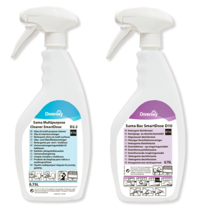 Sproeiflacons voor Suma Multipurpose Cleaner D2.3 en Suma Bac D10 in SmartDose. Er zijn zes flacons in een doos met losse etiketten voor beide producten.