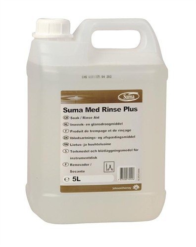 Suma Med Rinse Plus is zuur neutraliserend spoelglansmiddel en dompelreiniger voor medische instrumentenreiniging. Het is speciaal ontwikkeld voor gebruik in een uitgebreid gamma van reinigings- en desinfectieautomaten en vaatwasmachines. Het evenwichtige mengsel van niet-ionogene oppervlakteactieve stoffen en een neutraliserend zuur maakt het product uitermate geschikt voor een snelle droging zonder strepen en vlekken van alle gereinigde oppervlakken. Het product kan gebruikt worden in alle waterhardheden. Suma Med Rinse Plus is eveneens een uitstekende dompelreiniger voor bloed- en roestvlekken en allerlei andere soorten vlekken. Het product bevat bovendien ook ant-schuimcomponenten en voorkomt de opbouw van kalkafzettingen
