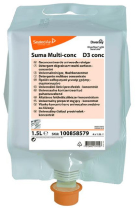Suma Multi conc D3 conc is een sterk geconcentreerde allesreiniger voor het manueel reinigen van alle oppervlakken in de keuken. Een optimaal mengsel van anionogene en niet-ionogene oppervlakte-actieve ingrediënten en alkalische stoffen dat vetten en ingedroogde voedselresten effciënt verwijdert. Het sequestreermiddel in de samenstelling maakt het product geschikt voor alle waterhardheden en zorgt voor uitstekende resultaten. Suma Multi conc D3 conc wordt gedoseerd met het Diverflow met Sure Link doseersysteem van Diversey Care.