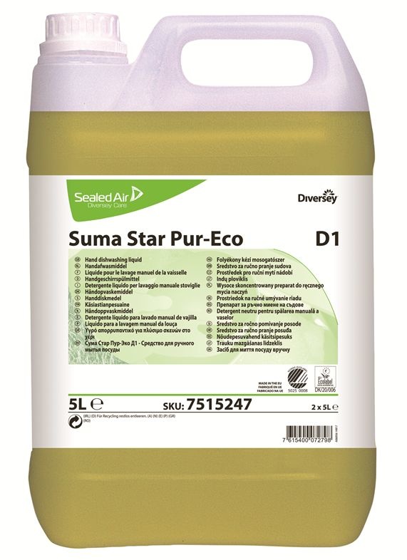 Suma Star Pur-Eco D1 is een geconcentreerd vloeibaar neutraal vaatwasmiddel voor het manueel reinigen van alle keukenmaterialen. Het product bevat anionogene en amfotere oppervlakte-actieve stoffen die ervoor zorgen dat ingedroogde voedselresten, vetten, eiwitten en zetmeel effectief verwijderd worden. Suma Star Pur-Eco D1 is goed afspoelbaar en zorgt voor een streeploos eindresultaat.