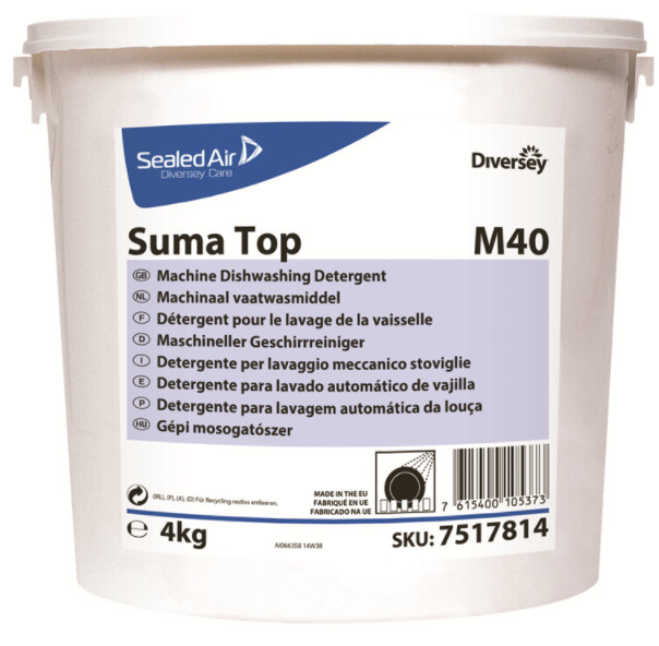 Suma Top M40 is een alkalische vaatwastablet geschikt voor handmatige dosering in kleine professionele vaatwasmachines. Het bevat alkalische ingrediënten voor de verwijdering van vuil en vetten. De formulering heeft ook een krachtige actieve stof voor het tegengaan van kalkopbouw bij alle waterhardheden. Bovendien heeft het een actieve bleekwerking tegen koffie- en theeaanslag.