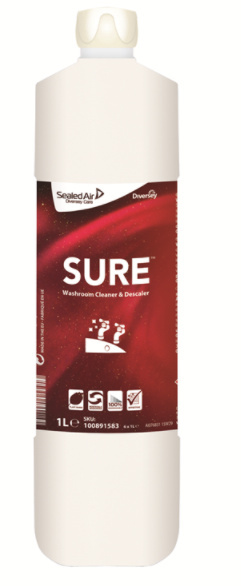 Deze geconcentreerde Diversey SURE-sanitairreiniger en ontkalker is milieuvriendelijk en krachtig genoeg om opgehoopte kalkaanslag, kalk- en zeepresten in een handomdraai te verwijderen. Breng de vloeistof op het oppervlak aan en wrijf daarna uit om resten te verwijderen en de glans tevoorschijn te laten komen. De gebruiksklare oplossing blijft de opbouw van kalk- en schuimaanslag voorkomen, waardoor onderhoud en toekomstige reiniging veel efficiënter worden.