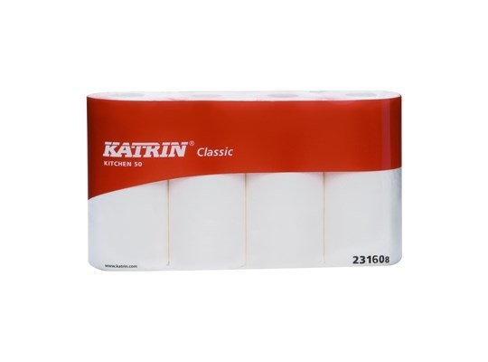 Katrin Classic keukenrol 2-laags. De witte Katrin Classic keukenrollen zijn 11,5 meter x 22,5 cm. In een pak zitten 28 keukenrollen. De keukenrollen zijn goedgekeurd voor gebruik met voedingsmiddelen.