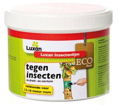 Luxan Insectenlijm is samengesteld uit natuurlijke componenten en voorkomt dat insecten tegen de stam omhoog kruipen. Het middel werkt onder andere tegen mieren ( die luizenkolonies verzorgen en uitbreiden), rupsen, mineermotten, wintervilnders en andere kruipende insecten. Luxan Insectenlijm kan direct op de stam worden aangebracht. Het kan ook worden ingezet om lijmbanden van een nieuwe kleeflaag te voorzien.