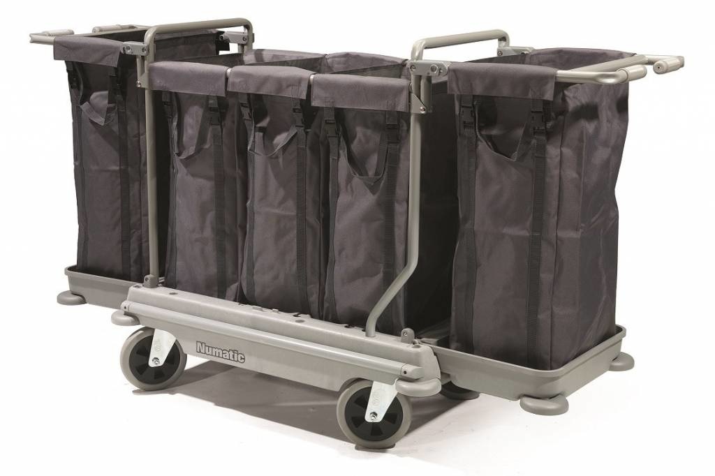 Mobiele waszakwagen met een sterke basis van Structofoam en vier grote zwenkwielen. Het metalen Nutex buizenframe biedt plaats aan verschillende soorten waszakken. Dit model heeft drie waszakken met een inhoud van 100 liter en twee uitbreidingskits met waszak van 100 liter, in totaal dus een capaciteit van 500 liter. Optioneel zijn zakken met een inhoud van 100 liter verkrijgbaar in de kleuren rood, blauw, groen, geel.