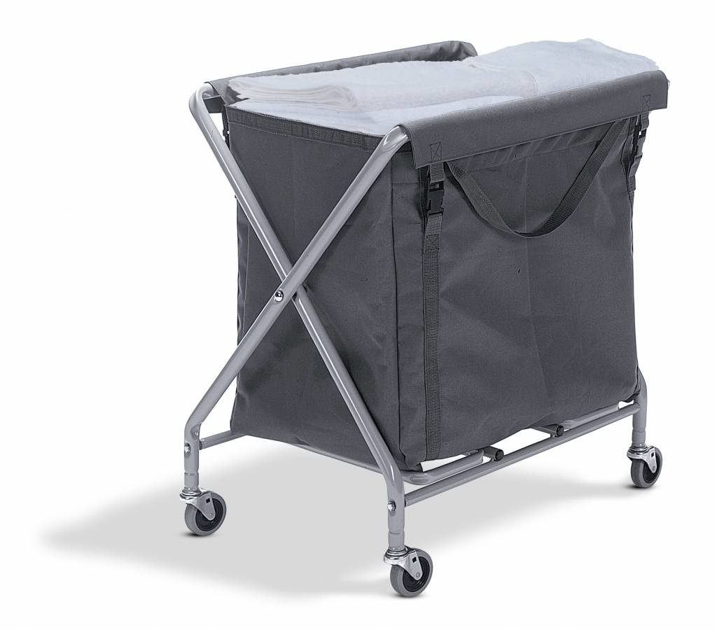 Praktisch en opvouwbare waszakwagen met het stalen Nutex buizenframe met vier 75 mm zwenkwielen en een makkelijk af te halen 150 liter waszak. De NX wasgoedwagens zijn snel en compact op te bergen.