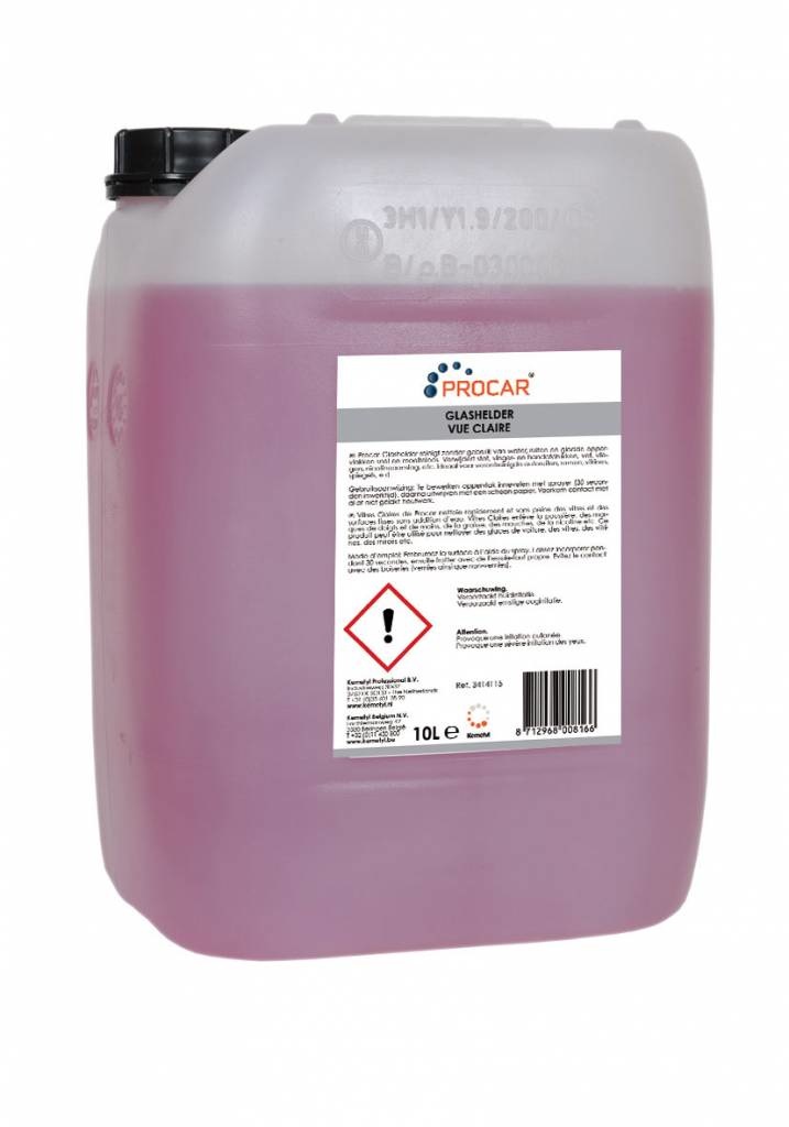 Procar Glashelder reinigt, zonder gebruik van water, ruiten en gladde oppervlakken snel en moeiteloos. Verwijdert stof, vinger- en handafdrukken, vet, vliegen, nicotineaanslag, etc. Ideaal voor verontreinigde autoruiten, ramen, vitrines, spiegels, e.d. Geeft een streeploos resultaat. Kan ook worden toegepast voor het ontvetten van autolakken. Pro- dukt heeft een ammonia geur.