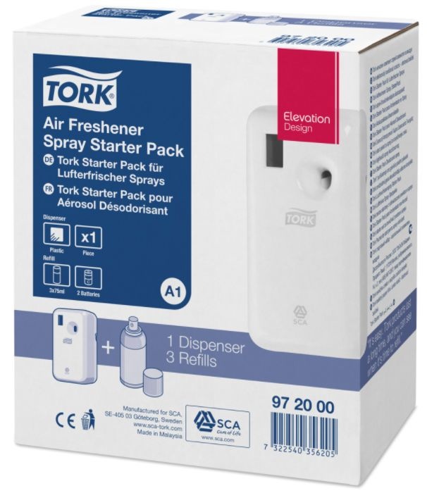 Het Tork Air-Box luchtverfrisser A1 startpakket bestaat uit 1 dispenser, 3 vullingen en 2 batterijen. Het Tork A1-systeem is uitermate geschikt voor sanitaire ruimtes.