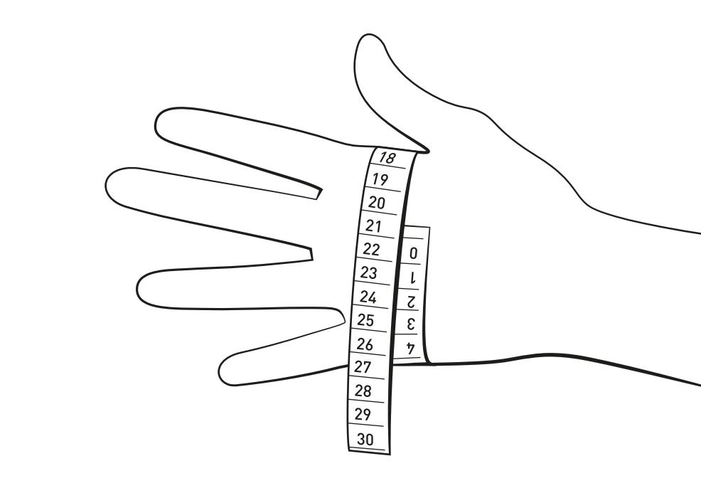 Meet uw handomvang op het breedste punt, onder de knokkels, zonder duim. De gemeten omvang is in de tabellen aan een bepaalde handschoenmaat toegewezen.