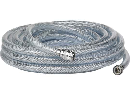 Complete slangenset, transparant, gewapend pvc, met 2 vaste snelkoppelingen (1/2" snelkoppeling en 1/2" slangpilaarkoppeling) en een 1/2” nippel kraanaansluiting. Goedgekeurd voor gebruik in de voedselindustrie.
