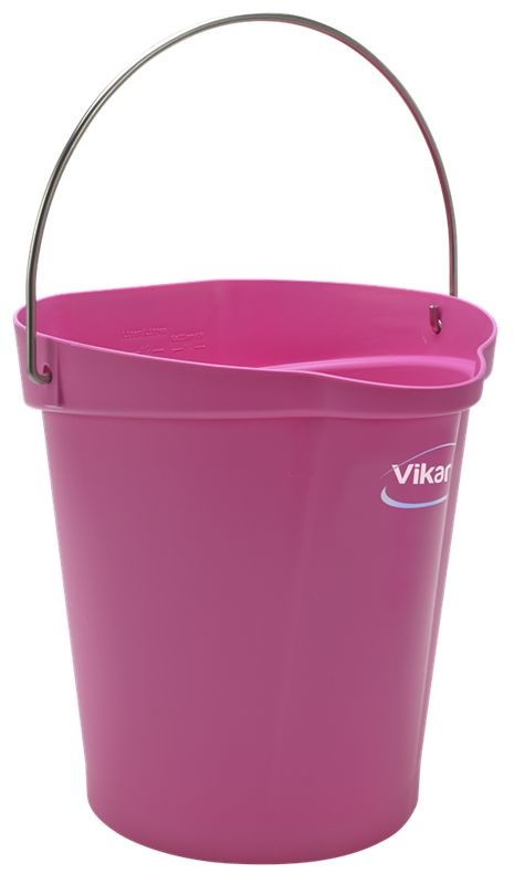 Een 12 liter Vikan emmer met veel extra's: vlakke achterkant voor simpele ophanging, maatverdeling in liters en gallons, hygiënische handgreep, speciale schenktuit voor gieten zonder spetteren, rvs hengsel zonder scherpe kantjes en een verstevigde bodem om ook bij hete vloeistoffen evenwicht te bewaren.