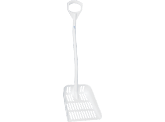 Ergonomische schop voorzien van uitlekgaten voor overtollig of ongewenst kook-, spoel- of lekwater. Ook voor gebruik als ijsschep in de vissector.