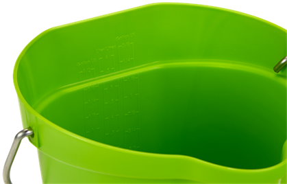 Een 6 liter Vikan emmer met veel extra's: vlakke achterkant voor simpele ophanging, maatverdeling in liters en gallons, hygiënische handgreep, speciale schenktuit voor gieten zonder spetteren, rvs hengsel zonder scherpe kantjes en een verstevigde bodem om ook bij hete vloeistoffen evenwicht te bewaren.