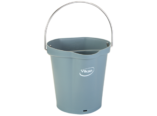 Een 6 liter Vikan emmer met veel extra's: vlakke achterkant voor simpele ophanging, maatverdeling in liters en gallons, hygiënische handgreep, speciale schenktuit voor gieten zonder spetteren, rvs hengsel zonder scherpe kantjes en een verstevigde bodem om ook bij hete vloeistoffen evenwicht te bewaren.