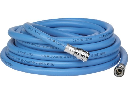 Complete slangenset, blauw (witte binnenkant), gewapend, met 2 vaste snelkoppelingen (0701) en 1 aansluiting (0700) voor op de kraan. Goedgekeurd voor gebruik in de food-industry volgens FDA normering.